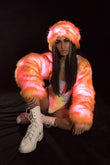 Steal the spotlight in this bold LED faux fur jacket. With vibrant neon colors and built-in light-up panels controlled by remote, this coat transforms any night into a show. Perfect for Halloween, festivals, stage performances, or baddie club looks, it’s the ultimate mix of glam and glow.